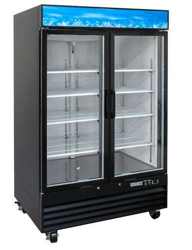 MoTak Refrigerator Merchandiser, two-section, 53-1/8"W x 31-7/8"D x 82-3/4"H, (2) double pane left & right hinged self-closing glass swing doors, (8) PVC coated adjustable heavy-duty shelves, electronic control system, 33°F to 41°F temperature range, LED lighting, white aluminum interior with stainless steel floor, coated adjustable steel black exterior, self-contained bottom-mount refrigeration.