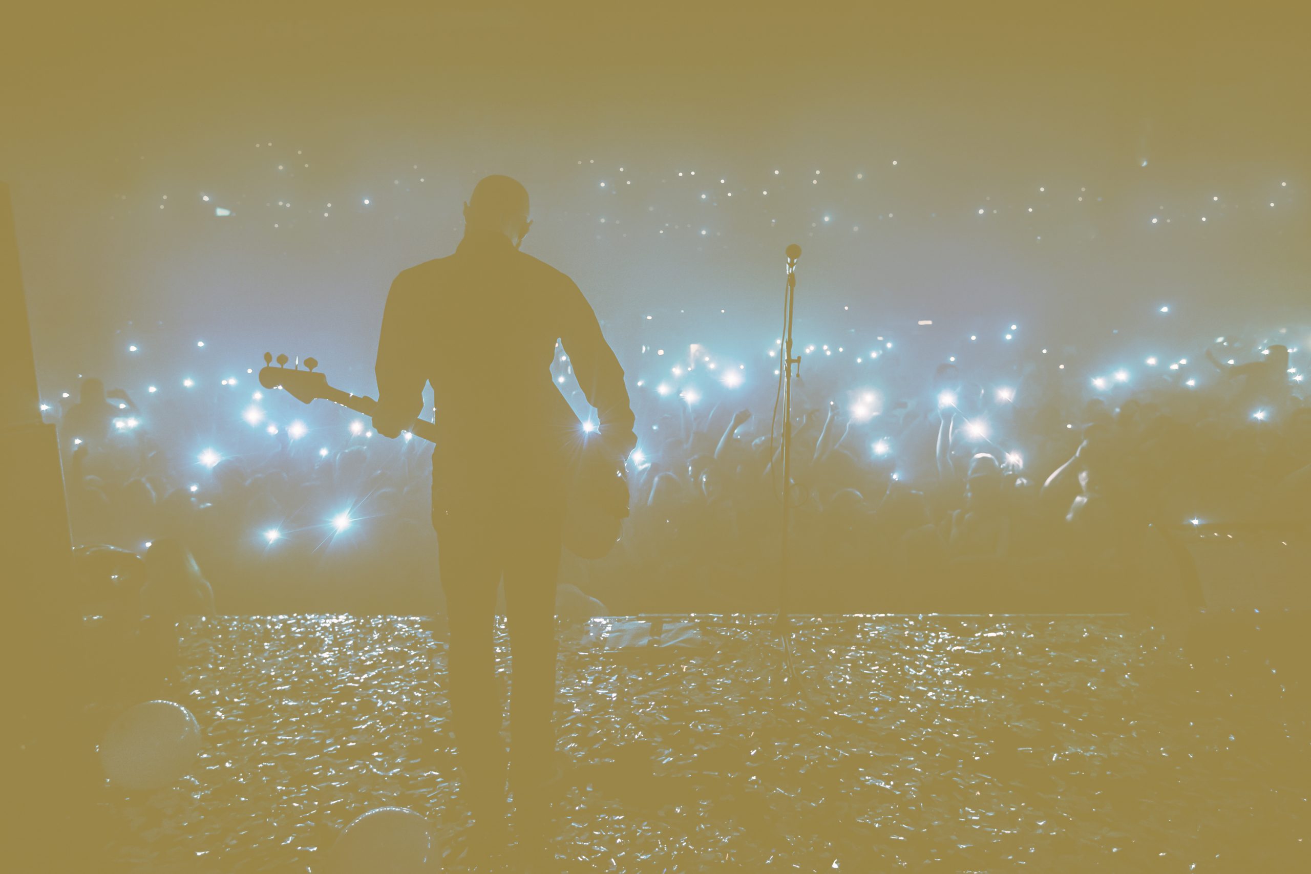 Guitar,Player,In,Front,Of,Crowd,On,Scene,In,Night ← Previous Next → Guitar player in front of crowd on scene in night club. Bright stage lighting, crowded dance floor. Phone lights at concert. Band blue silhouette crowd. People with cell phone lights.