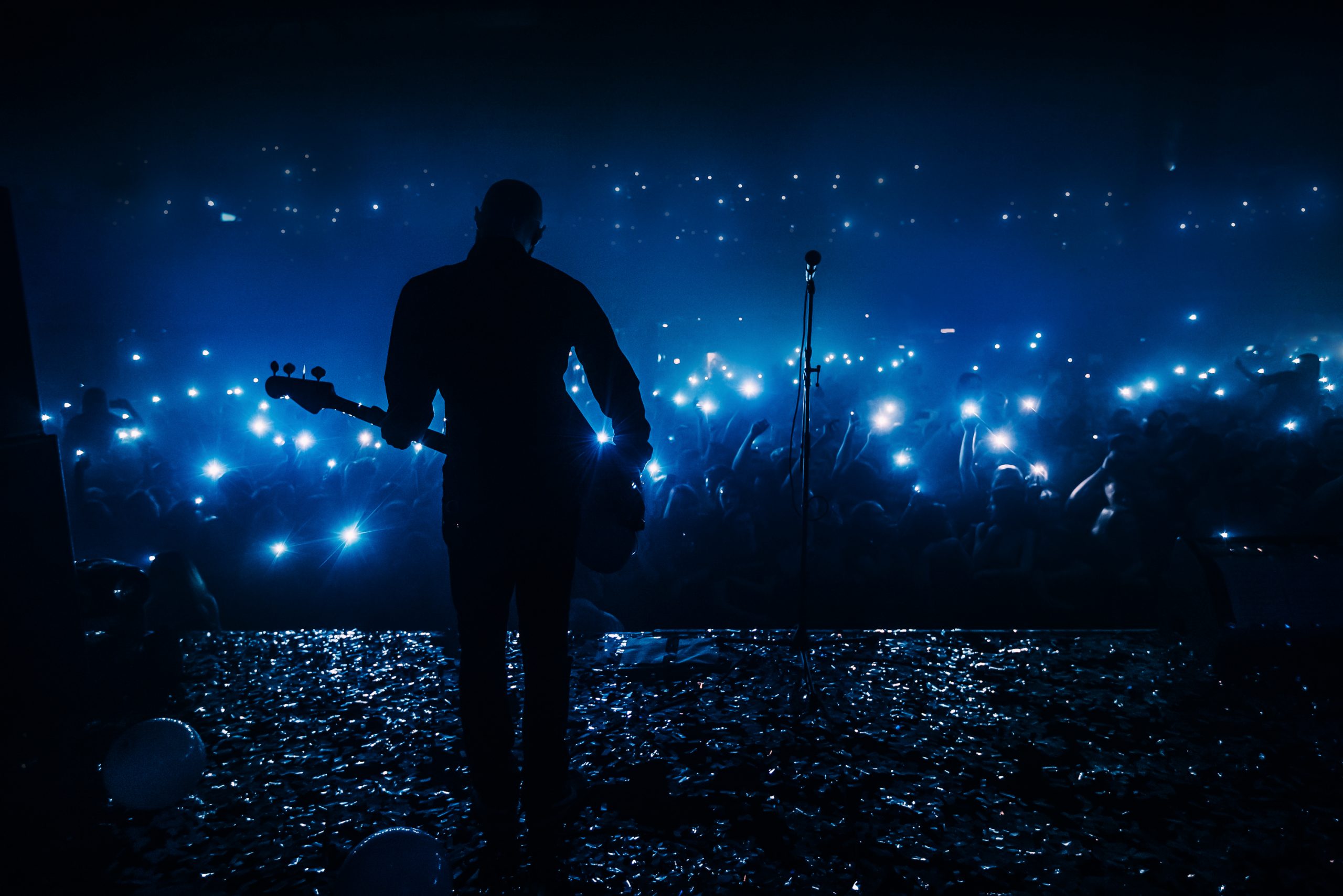 Guitar,Player,In,Front,Of,Crowd,On,Scene,In,Night